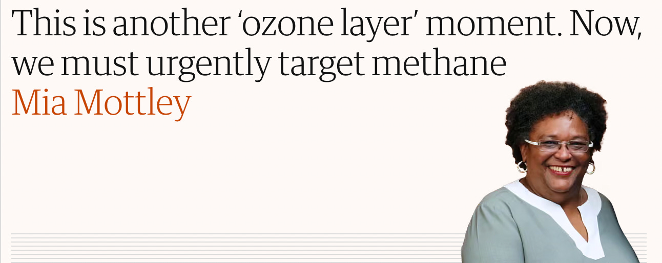 I think Barbados’ Prime Minister Mia Mottley gets it exactly right in this Guardian op-ed, both from a solutions and a framing perspective. She argues that a legally-binding methane agreement, much like the ozone-closing work established by The Montreal Protocol, could buy us time and help solve the methane crisis. The ozone layer is held up, rightly, as a relatively short-windowed success, demonstrating that we can indeed come together, globally, to solve big climate problems.